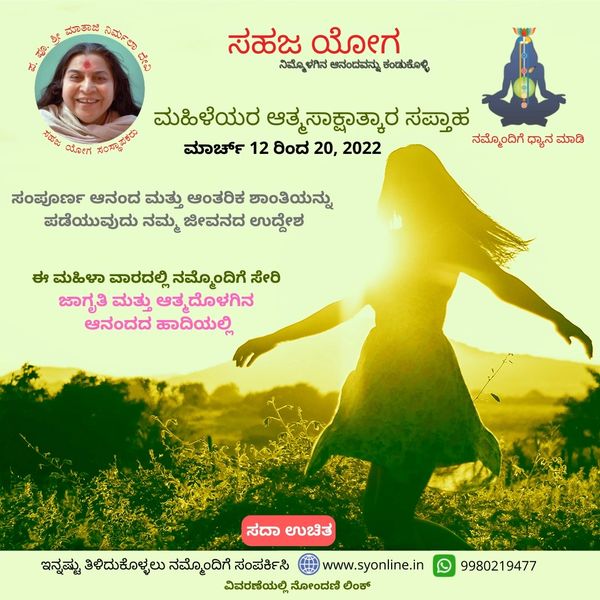 ಸಹಜ ಯೋಗ ಧ್ಯಾನ ಆಧ್ಯಾತ್ಮಿಕ ಇತಿಹಾಸದಲ್ಲಿ ಅನನ್ಯ ಆವಿಷ್ಕಾರವಾಗಿದೆ. ನಮ್ಮಲಿ ಸಂಗ್ರಹಿಸಿರುವ ಆಂತರಿಕ ಶಕ್ತಿಯ ಜಾಗೃತಿಯಿಂದ ಸಹಜವಾಗಿ ಪರಿವರ್ತನೆಯನ್ನು ಮಾನವರಲ್ಲಿ ಕಾಣಬಹುದು.ಶ್ರೀ ಮಾತಾಜಿ ನಿರ್ಮಲಾ ದೇವಿಯವರು ಈ ಅತ್ಯದ್ಭುತ ಧ್ಯಾನ ಪ್ರಕ್ರಿಯೆಯನ್ನು ಕಂಡುಹಿಡಿದರು, ಸುಮಾರು 120 ಕ್ಕೂ ಅಧಿಕ ರಾಷ್ಟ್ರಗಳಲ್ಲಿ ಇಂದು ಸಹಜ ಯೋಗ ಧ್ಯಾನವನ್ನು ಅಭ್ಯಾಸ ಮಾಡಲಾಗುತ್ತಿದೆ .ಏಲ್ಲಾ ವರ್ಗದ ಮನುಷ್ಯರಲ್ಲಿ ಹಿತವಾದ ಬೆಳವಣಿಗೆ ಕಂಡು ಬರುತ್ತಿದೆ.ಬನ್ನಿ ನಮ್ಮ ಉಚಿತ ಆನ್ಲೈನ್ ಅವಧಿಗಳ ಮುಖಾಂತರ ಜಾಗೃತಿಯ ಪ್ರಯಾಣದಲ್ಲಿ ಭಾಗಿಯಾಗಿ.